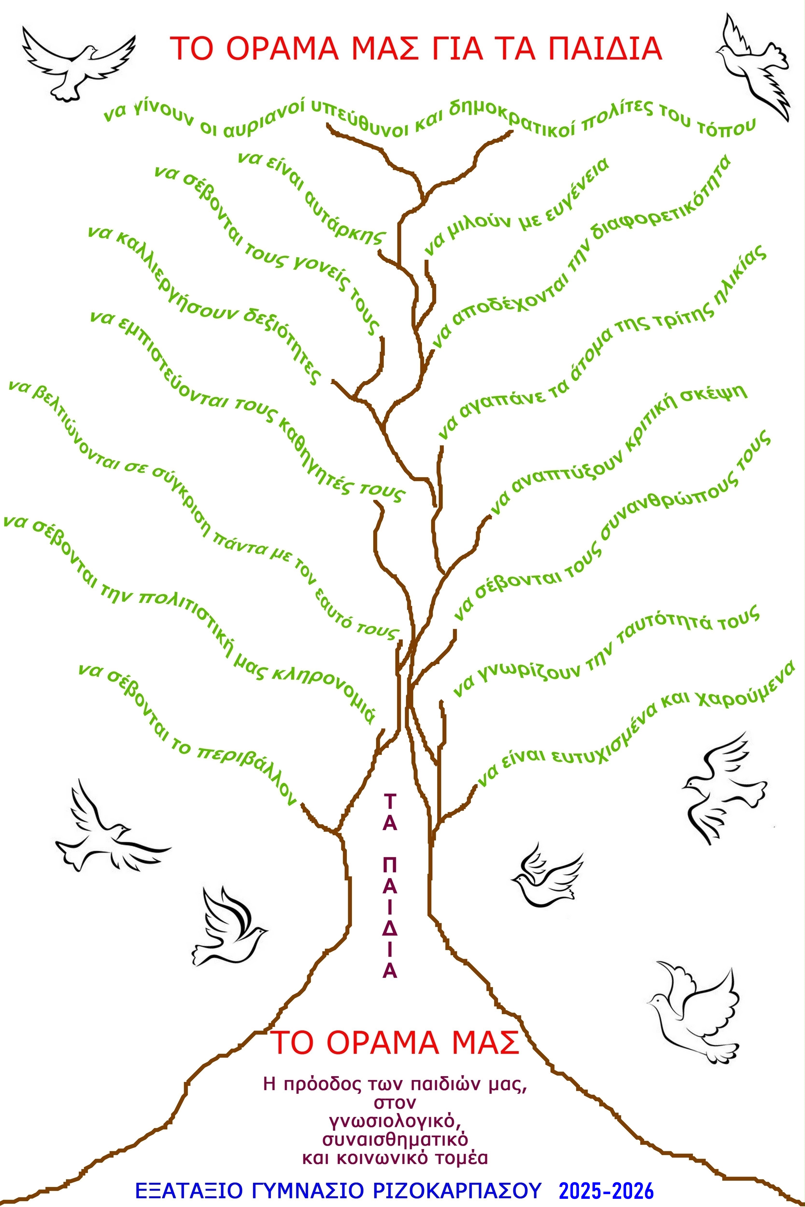 Σας καλωσορίζω με χαρά στην ιστοσελίδα του Εξατάξιου Γυμνασίου Ριζοκαρπάσου. Μέσα από αυτήν επιδιώκουμε να αναδείξουμε το ποικίλο έργο του Σχολείου μας: τις σχολικές εκδηλώσεις και δράσεις μαθητών και καθηγητών που διαμορφώνουν τη ζωντανή πραγματικότητα του Σχολείου.